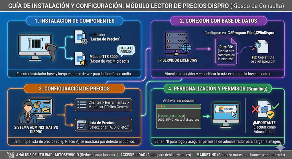 Este video es un tutorial técnico para instalar y configurar el módulo "Lector de Precios" de DisPRO. Este módulo adicional convierte una computadora (con pantalla y escáner) en un kiosco de consulta para que los clientes verifiquen precios por sí mismos en tiendas como ferreterías o supermercados. También cubre cómo personalizar la imagen de fondo (branding) y configurar el motor de voz que "lee" el precio en voz alta.