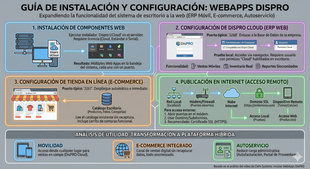 Este video es un tutorial técnico avanzado sobre cómo instalar, configurar y desplegar las Aplicaciones Web de DisPRO. Estas herramientas extienden la funcionalidad del sistema de escritorio a navegadores web, permitiendo acceder a módulos como DisPRO Cloud (versión móvil del ERP) y la Tienda en Línea desde cualquier lugar. Se explica el proceso de instalación en el servidor, la asignación de puertos y cómo probarlas localmente.